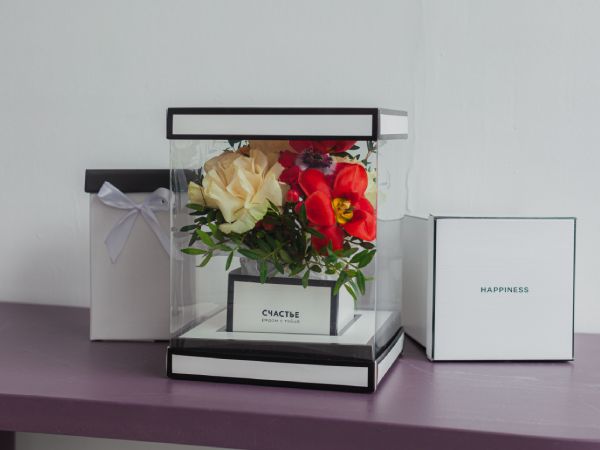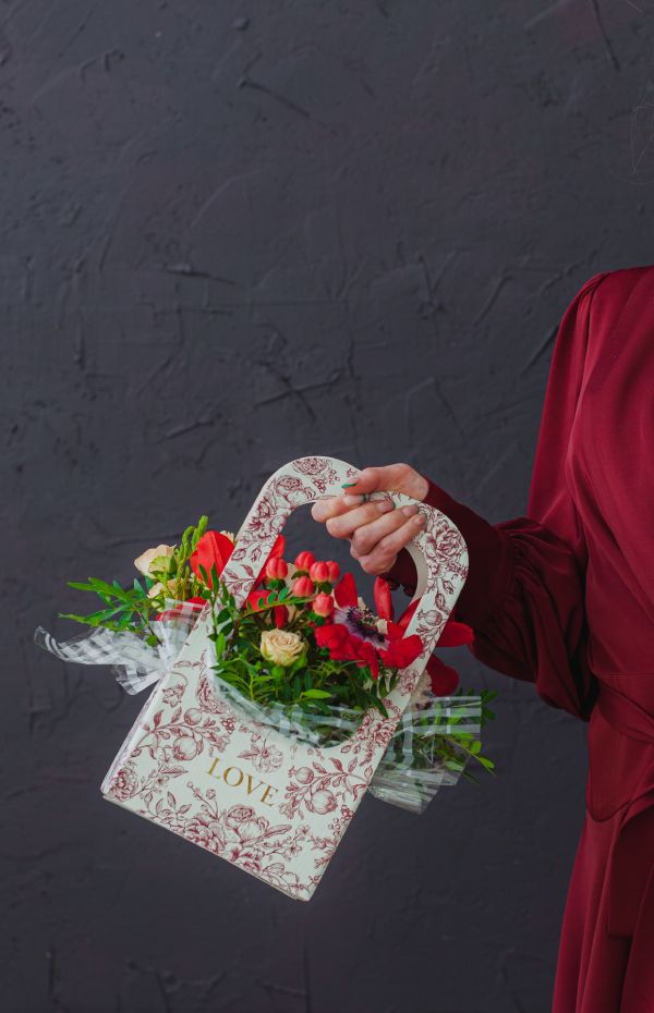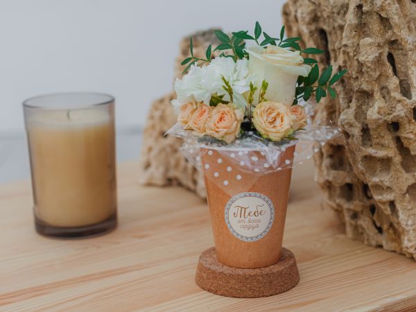Презент почти всегда сопровождают букетом — даже мужчинам вручают цветы на юбилей. И если с подарочной упаковкой вы вдруг не угадали, есть шанс произвести вау-эффект с помощью оформления цветов. Просто откажитесь от стандартных вариантов, которые предлагают в каждой флористической лавке, и выберите оригинальное решение. Внимание получателя однозначно привлекут пакеты-переноски, коробки-вазы, а также всевозможные стаканчики, ведёрки и кашпо. Выбор конкретной упаковки зависит от размеров букета и масштабов праздника.