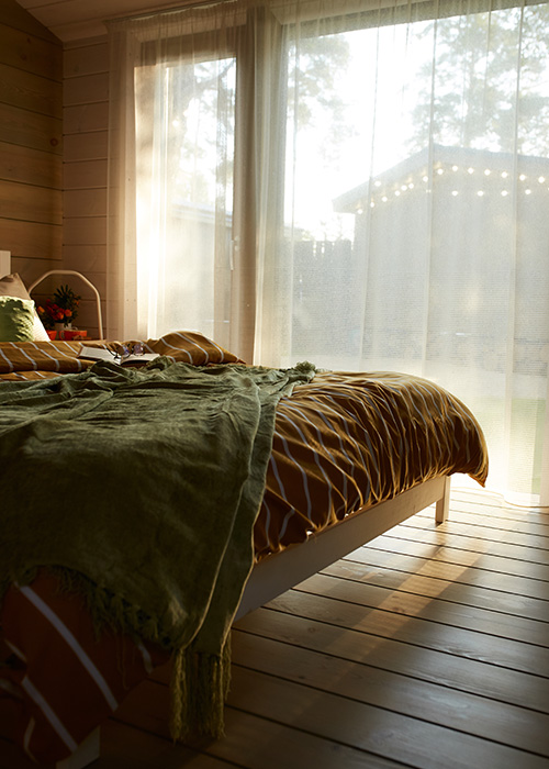 Обратите внимание на постельное бельё в золотых оттенках. Такие тона помогут настроиться на продуктивное утро и стабилизировать эмоциональное состояние. А лёгкие фактуры подарят приятные тактильные ощущения.