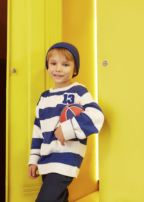 Яркий полосатый джемпер придаст образу решительности и динамики. Дополнить наряд можно стильной шапкой в рубчик и очаровательной улыбкой.