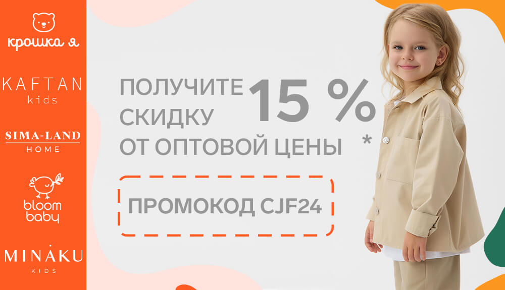Заказывайте эксклюзивную детскую одежду наших брендов и получайте скидку 15 % от оптовой цены*.