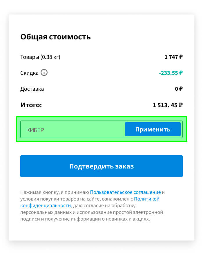 - С 14 по 25 января включительно оформите заказ**, введите промокод КИБЕР в специальном поле и нажмите «Применить». Завершите оформление.