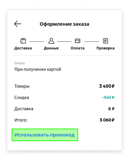 В мобильном приложении поле для ввода промокода появится на последнем, 4-м шаге, когда вам предложат проверить введённые данные