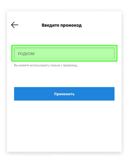 После нажатия на кнопку «Использовать промокод» появится пустое поле. Введите в него промокод РОДКОМ большими буквами, как показано на скриншоте