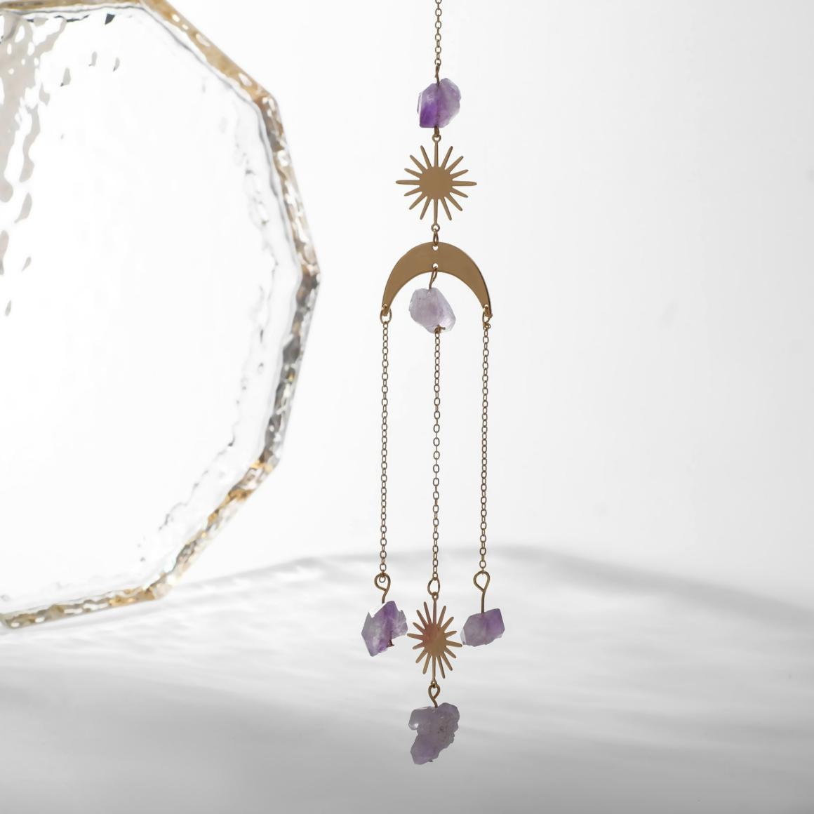 В качестве цветных подвесов у аксессуара использован настоящий камень. Дымчатый аметист, напоминающий кусочек метеорита.