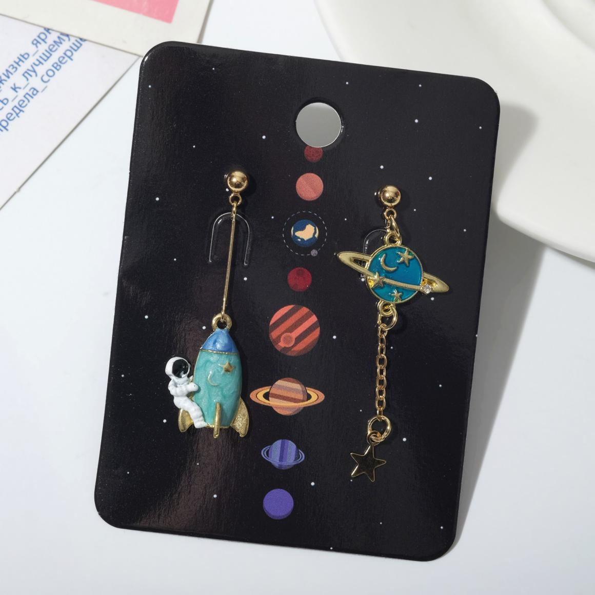 Ещё один вариант асимметрии в бижутерии. От первого лота нашей подборки он отличается детальностью. На две небольшие серьги уместились и планета, и звёзды, и космонавт с ракетой. С таким украшением точно не будет вопросов, кто Мисс Вселенная на праздничной вечеринке.