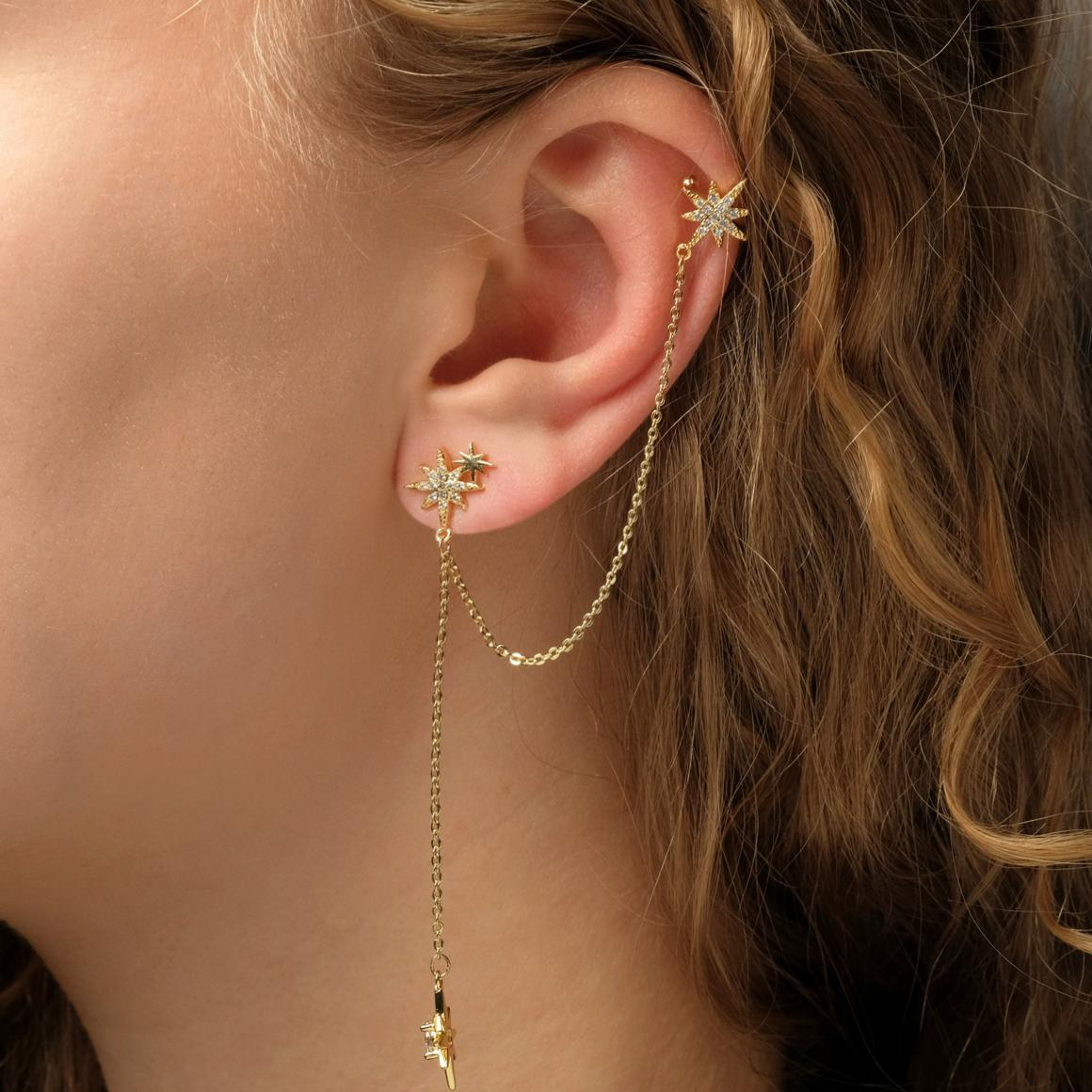 На ушах такой пазл выглядит необычно и привлекает внимание к лицу. Удачное решение, если хотите подчеркнуть выразительные скулы или тонкую шею.