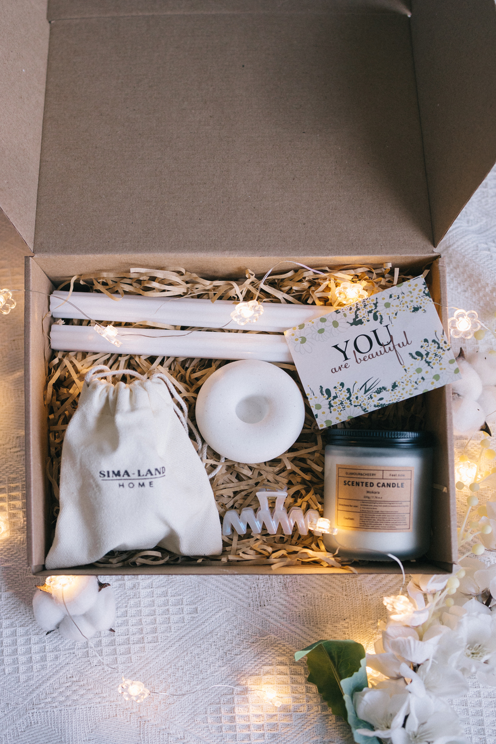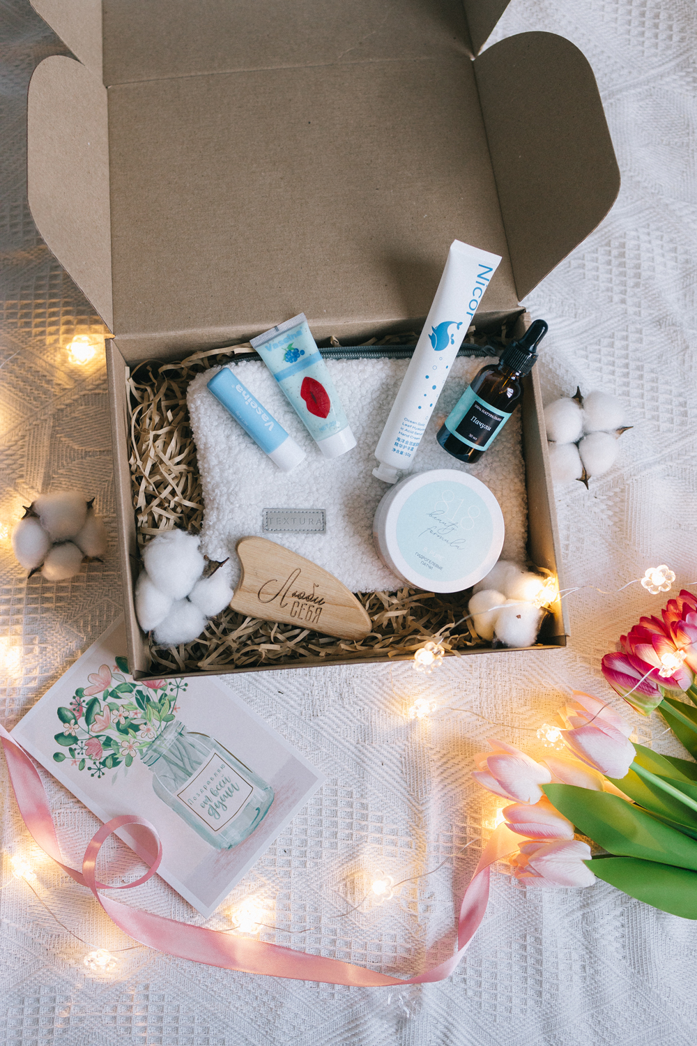 Здесь уместна личная забота и учёт предпочтений. Можно выбрать что-то, ориентируясь на её хобби: набор для творчества, сертификат в книжный магазин. Или составить бокс в трендовом цвете.